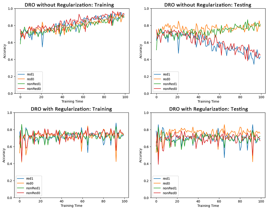 To apply the DRO model, we separate the dataset into four subgroups based on color (red or green) and label (0 or 1). Then train a model that minimize the risk of the group with highest risk. This effectively eliminate the influence of spurious correlation. Moreover, to avoid overfitting, we use DRO model regularization. This model have satisfying training and testing accuracy.
