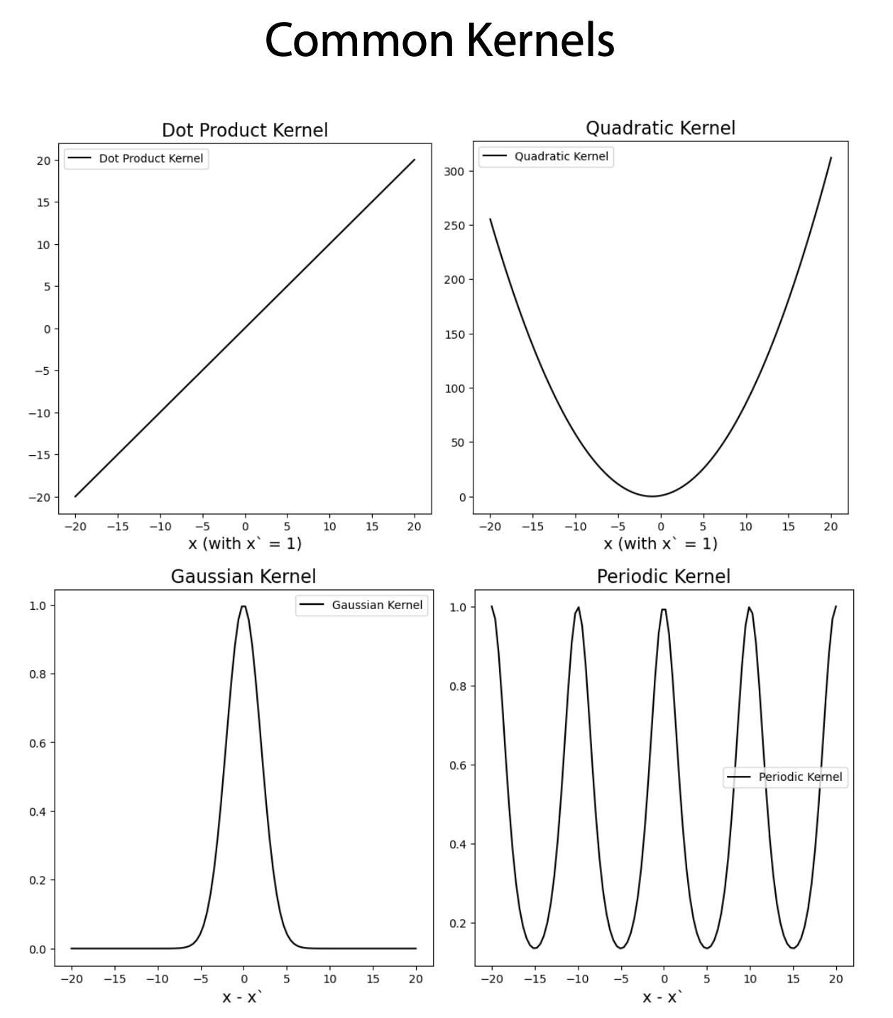 • The periodic kernel: \(k(\bold{x}, \bold{x'}) = e^{-2sin(\frac{|\bold{x}-\bold{x'}|}{10})}\).