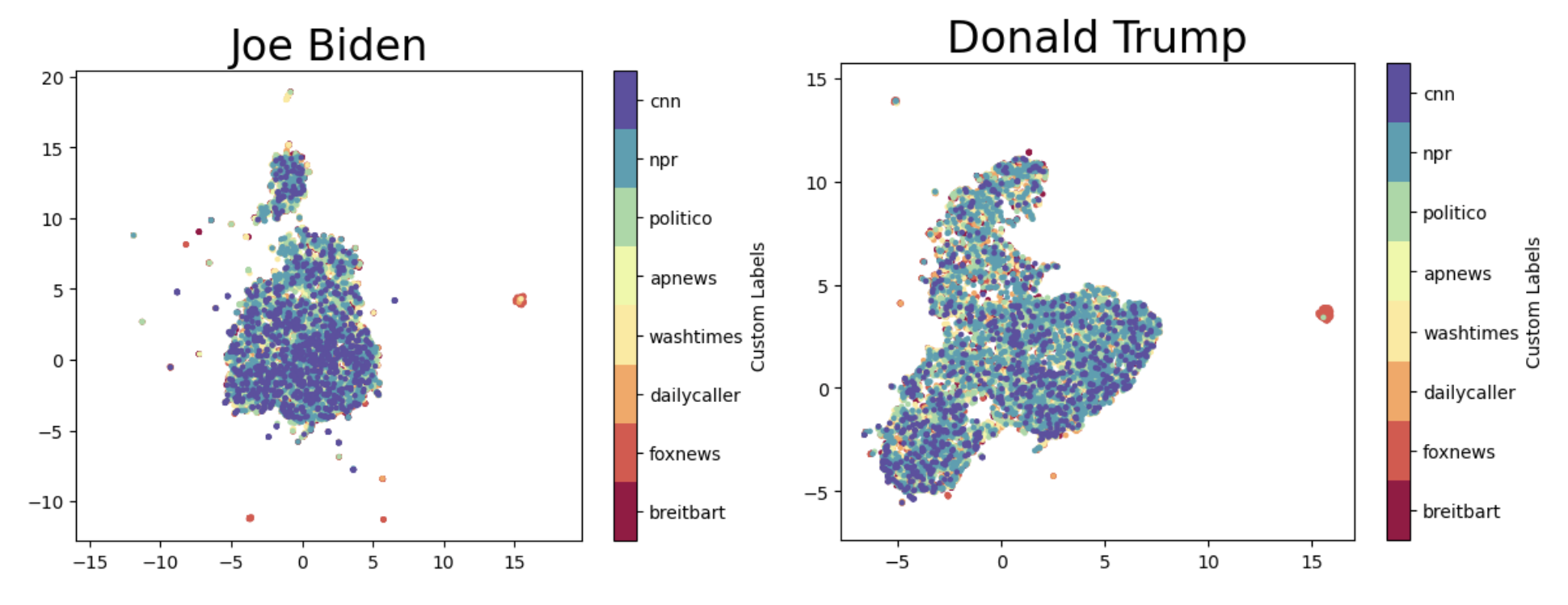 • The first and intuitive one is to visualize the logits. We implemented the UMAP to reduce the dimension of the logits to 2, and for each politicians we created a scatter plots with different colour for different news corporations or media bias. The above are some examole plots. According to these plots, we could not distingished the emotions based on news corporations