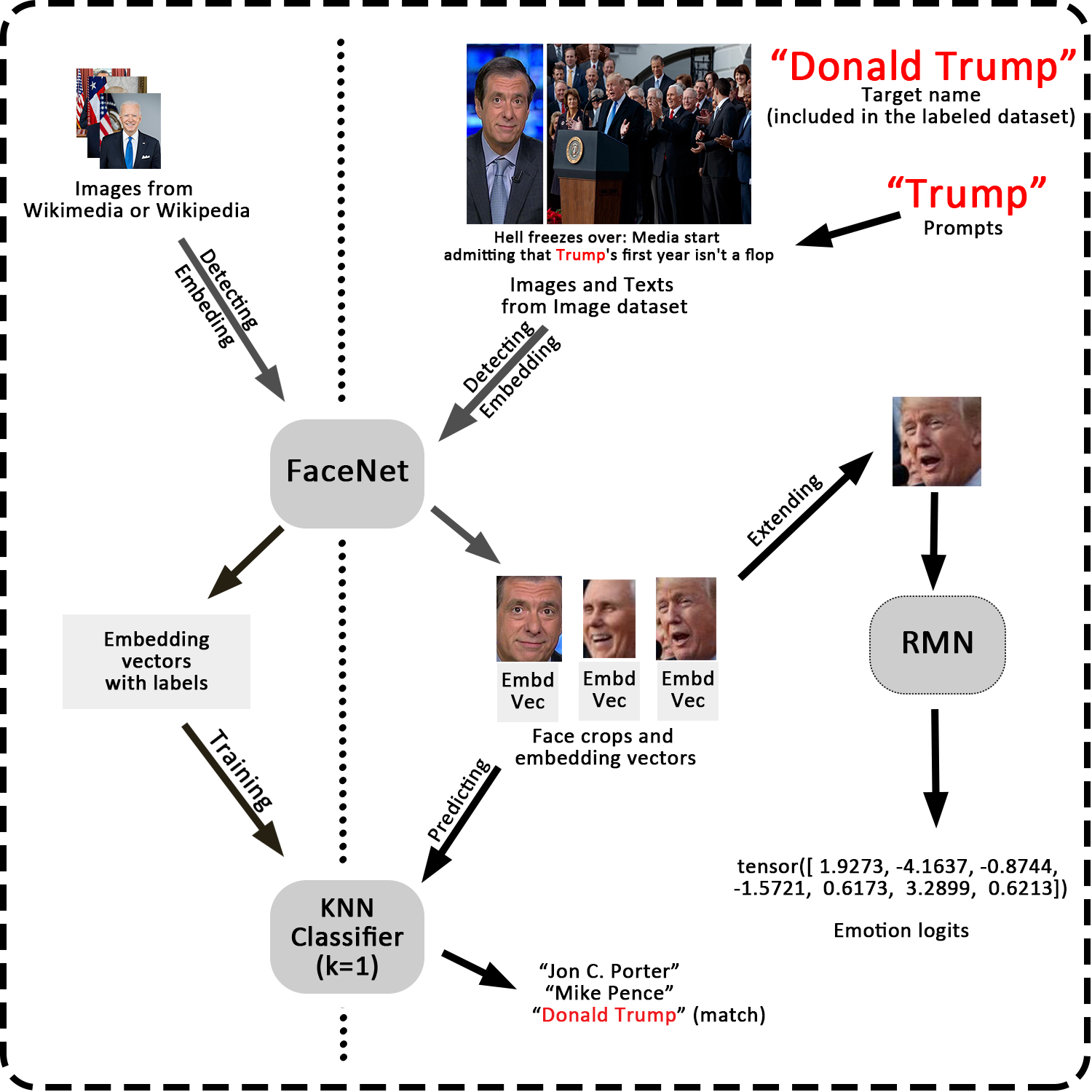 1. We need to build a name recognition model, which detects if there are faces and who they are for an input image. Therefore, we need a labelled dataset, containing images of politicians' faces and their names. Wikimedia is a proper dataset for this, as it contains some metapages of "21st politicians in United States", where the page of each politician contains a portrait as well as some relevant images of them. For each politician, We passed the portrait through FaceNet to get the "controlled embedding vector", and collected more faces with embedding vector closed to the controlled one. After this process we get the label dataset, then trained a KNN model with \(k=1\) as the name recognition model.